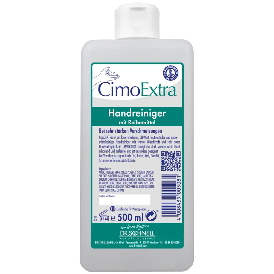 CIMOEXTRA ist ein lösemittelfreier, pH-Wert hautneutraler und reibemittelhaltiger Handreiniger mit starker Waschkraft und sehr guter Hautverträglichkeit. CIMOEXTRA reinigt die stark verschmutzte Haut schonend und seifenfrei und ist besonders geeignet _x000D_ bei Verschmutzungen durch Öle, Fette, Ruß, Graphit, _x000D_ Schmierstoffe oder Metallstaub.