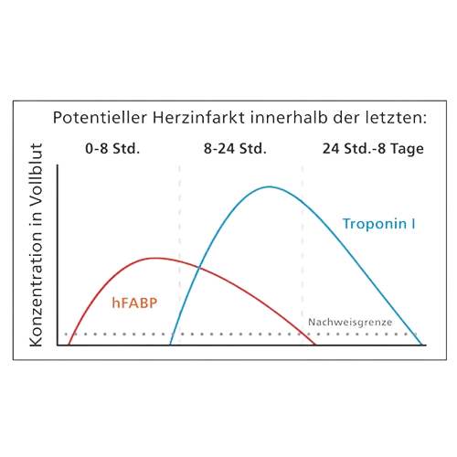 • hFABP, welches sich bei einem Infarkt sehr schnell im Blut freisetzt (bereits nach 20 Minuten), auch ideal für das Reinfarkt-Monitoring am 4.Tag