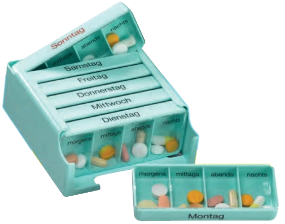Die zuverlassige Hilfe für alle Menschen, die regelmäßig mehrmals täglich Arzneimittel einnehmen müssen. Dient der Arzneimittelsicherheit und kontrolliert die richtige Einnahme der vom Arzt verordneten Medikamente. Übersichtlich und einfach in der Handhabung. Die großen Einzelfächer bieten genugend Platz zur Aufnahme von mehreren Medikamenten. Die Tagesdosen können separat mitgenommen werden. Aus hochwertigem und langlebigem ABS-Kunststoff hergestellt. Jahrelang bewährt im ambulanten und stationären Einsatz. Keine scharfen Kanten oder Ecken. Die farbigen Ausführungen gewährleisten gute Sichtbarkeit weißer Tabletten und dienen zur Unterscheidung bei mehreren Nutzern in einem Haushalt.